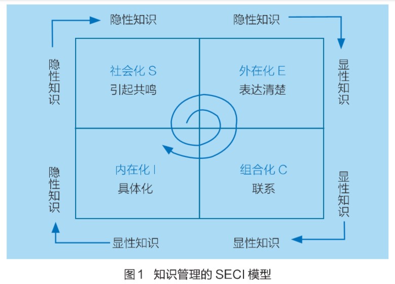 作為設(shè)計管理的重要一環(huán),知識管理按照“收集—分類—整理—儲存—利用—創(chuàng)新”的路徑推進(jìn),其中最大的難題莫過于“隱性知識和顯性知識的互相轉(zhuǎn)化”?;诖?,日本著名知識管理專家野中郁次郎提出了 SECI 模型(圖1),為知識管理提出了奠基性的理論和方法。