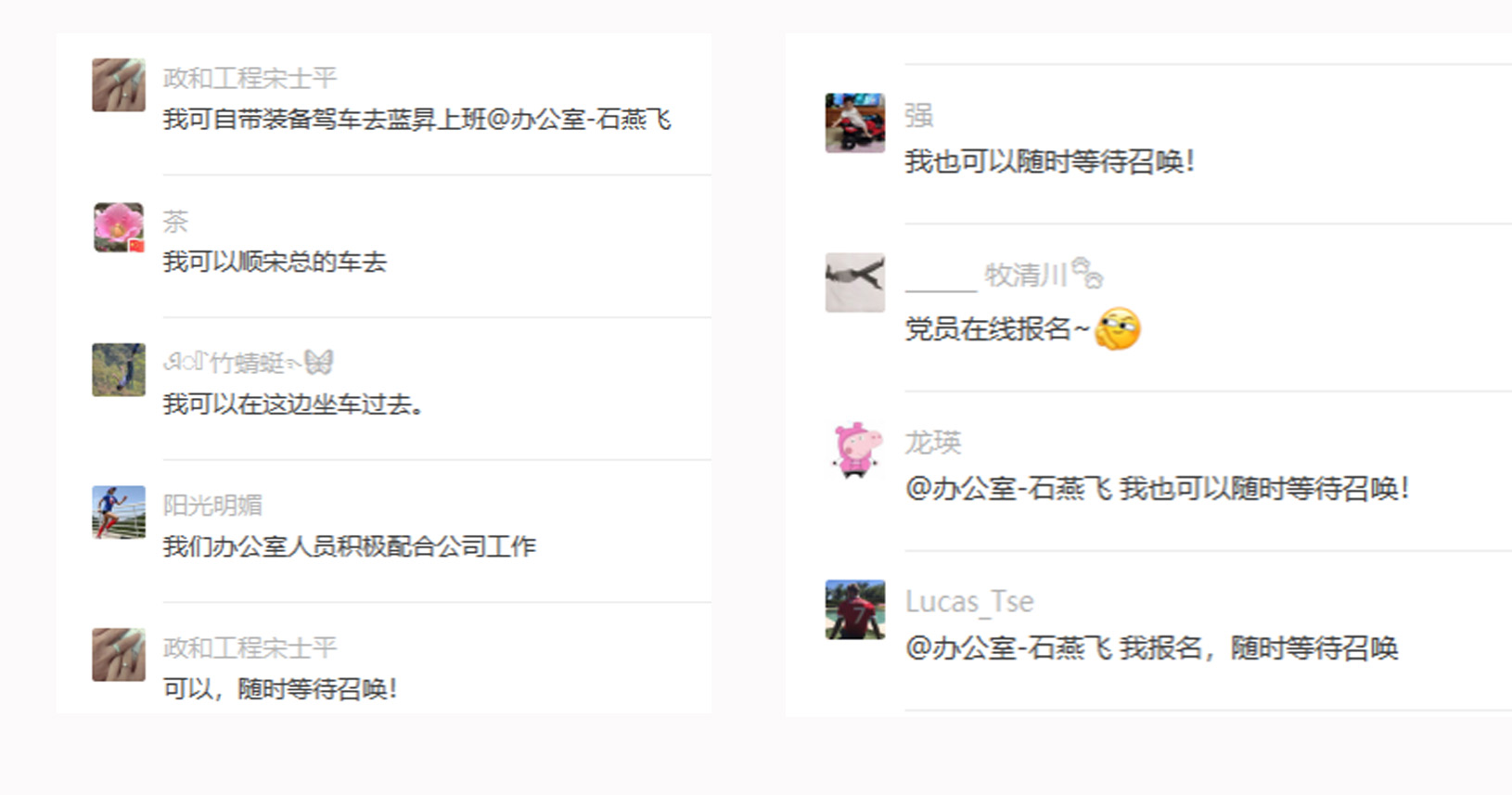 由于辦公大廈出現(xiàn)疑似病例,5月29日突然被封,公司預(yù)感事態(tài)嚴重,馬上成立疫情指揮應(yīng)急小組,出臺緊急應(yīng)對措施,一方面通知大家做好居家辦公準備,二是尋求臨時對外辦公點,并組織有條件出行的員工輪值上班,在“活力政和”群里,無論是共產(chǎn)黨員、優(yōu)秀員工骨干或是普通員工都踴躍報名表示參加,紛紛回復(fù)“我可以”“隨時等待召喚”“在線報名”等。公司“臨時辦公點”也隨著疫情的蔓延和防控要求不斷變換,從海珠區(qū)的藍昇分公司轉(zhuǎn)移到越秀的醫(yī)藥分公司,最后輾轉(zhuǎn)到中山分公司,堪稱游擊戰(zhàn)術(shù)與疫情捉迷藏。期間6月3日下午,芳村地區(qū)開始封城,公司臨時辦公點的值班點人員在回家路上受到路況限制,在重重關(guān)卡中經(jīng)多次繞道才得以回到家中。