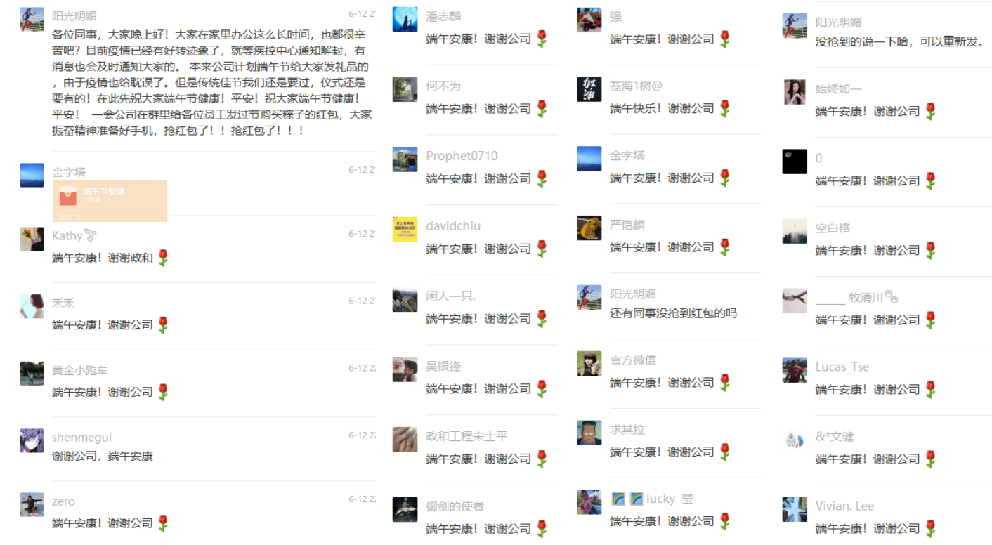 公司疫情指揮應(yīng)急小組在防疫期間,先后發(fā)出了“居家辦公通知”“告全體員工信”“廣州員工軌跡跟蹤記錄(每天)打卡表”“員工疫情期間工作及工作影響表”“分發(fā)端午節(jié)紅包”“復(fù)工通知”等文件通知,有條不紊地對各項工作進行布置,安撫員工心情和思想動態(tài),關(guān)心員工行蹤的安全,直至疫情結(jié)束。